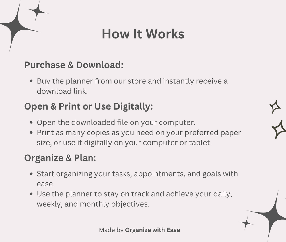 Are you struggling to keep track of your daily tasks and goals? Our Organize With Ease Planner is here to help you streamline your schedule, boost your productivity, and achieve your goals effortlessly.